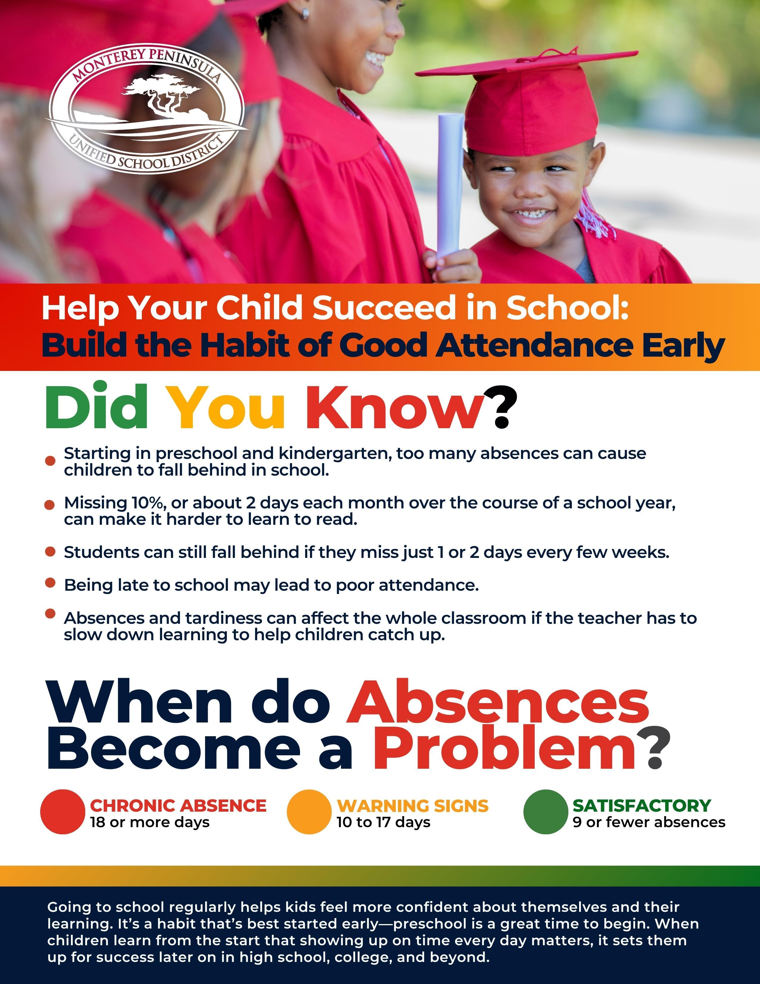 MPUSD and Monte Vista have high expectations for consistent and committed attendance at school. Whether excused or unexcused, absences add up to a loss of learning time, and can quickly lead to academic and social-emotional challenges. Defined as missing 10 percent of the school year (18 days a year or just 2 - 3 days each month), chronic absenteeism can translate into:
